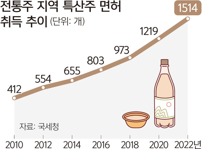 문제는 너무 많은 창업자들이 몰리고 있다는 것이다. 2022년 기준 지역 특산주 면허 취득 개수는 2010년 412개에서 2022년 기준 1514개. 시장도 커졌지만 경쟁사 역시 2배 이상 늘었다고 볼 수 있다.