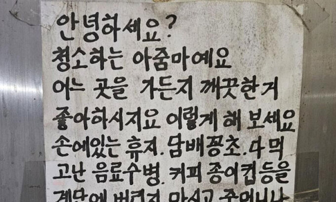 안내문은 "안녕하세요? 청소하는 아줌마예요"라는 문장으로 시작한다. 이어 "어느 곳을 가든지 깨끗한 거 좋아하시지요. 이렇게 해 보세요. 손에 있는 휴지, 담배꽁초, 다 먹고 난 음료수병, 커피 종이컵 등을 계단에 버리지 마시고 주머니나 가방에 넣었다가 휴지통에 넣어 보라"고 당부했다.