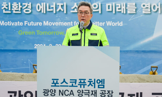 김준형 포스코퓨처엠 대표이사는 22일 전남 광양 율촌제1산업단지에서 개최된 포스코퓨처엠의 하이니켈 NCA 전용 공장 착공식에서 이같이 말했다. 착공식에는 김익현 삼성SDI 부사장도 참석했다. 이번 공장에서 생산할 하이니켈 NCA 양극재가 전량 삼성SDI에 공급돼서다.