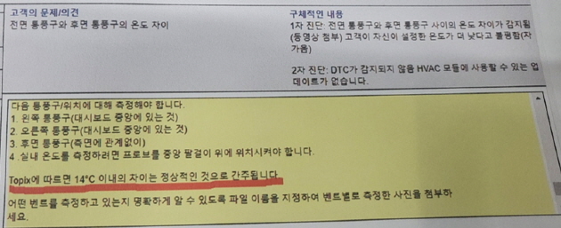 해당 차량은 에어컨 작동시 앞좌석에는 뒷좌석에서는 뜨거운 바람이 나왔다.