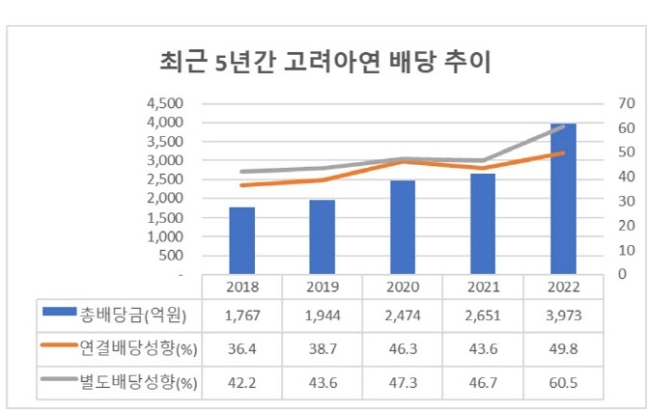 고려아연이 웹사이트에 공개한 최근 5년간 배당내역 추이를 살펴보면, 총배당금액은 2018년 1767억원을 시작으로 2022년 3973억원까지 지속적으로 증가하고 있다.