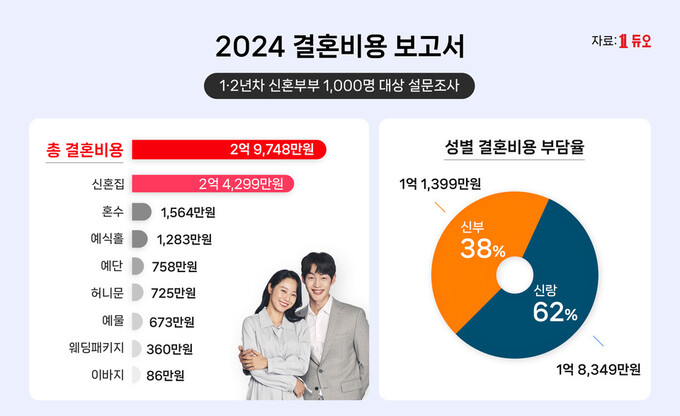 결혼정보회사 듀오가 최근 2년 이내 결혼한 신혼부부 1000명(남 500명, 여 500명)을 대상으로 조사한 ‘결혼비용 보고서’를 발표했다.