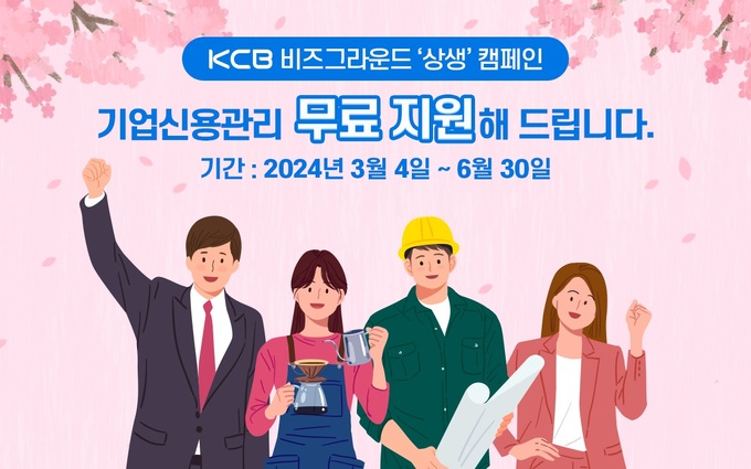 KCB 관계자는 “코로나19는 끝났지만 높은 대출금리와 더딘 경기회복으로 경영환경이 악화된 가운데 중소기업, 소상공인 등의 어려움이 지속되고 있어 올해도 무료지원 캠페인을 진행하게 되었다.”라며, “이러한 시장 환경에서 더욱 중요해진 기업신용관리에 도움이 될 것으로 기대 한다”고 말했다. 한편 이번 캠페인은 3월 4일 ~ 6월 30일까지 비즈그라운드 PC웹 홈페이지를 통해서 진행된다.