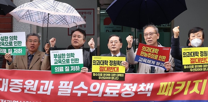 5000여명의 지역 의사가 활동하는 대전시의사회는 29일 오후 국민의힘 대전시당 앞에서 집회를 열고 의대 정원 증원과 필수 의료 정책 패키지를 추진하려는 정부를 규탄했다.
