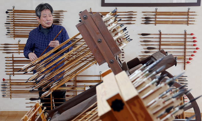 양태현 궁시장이 여러 과정을 거쳐 완성된 화살을 살펴보고 있다.