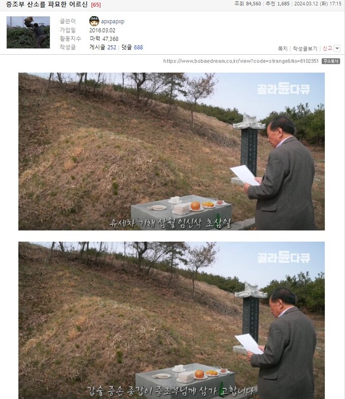 12일 한 온라인 커뮤니티에는 ‘증조부 산소를 파묘한 어르신’이라는 제목의 게시글이 올라왔다.