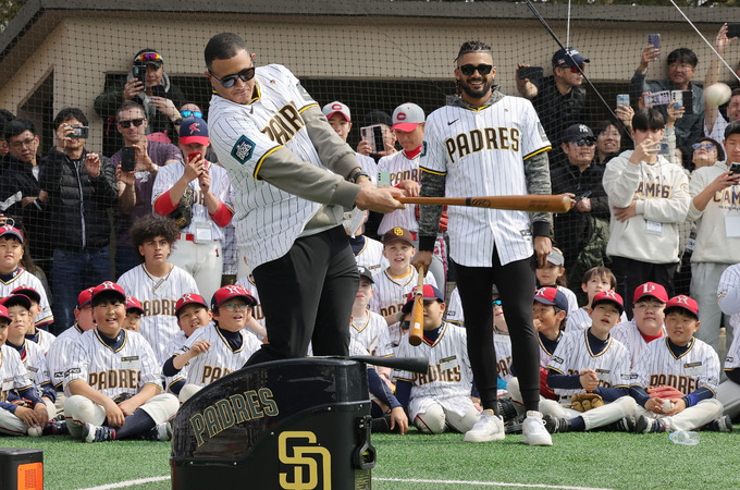 샌디에이고 파드리스 매니 마차도 선수가 16일 서울 용산 어린이정원에서 열린 '메이저리거 참여 어린이 야구교실'에서 티볼을 치고 있다.