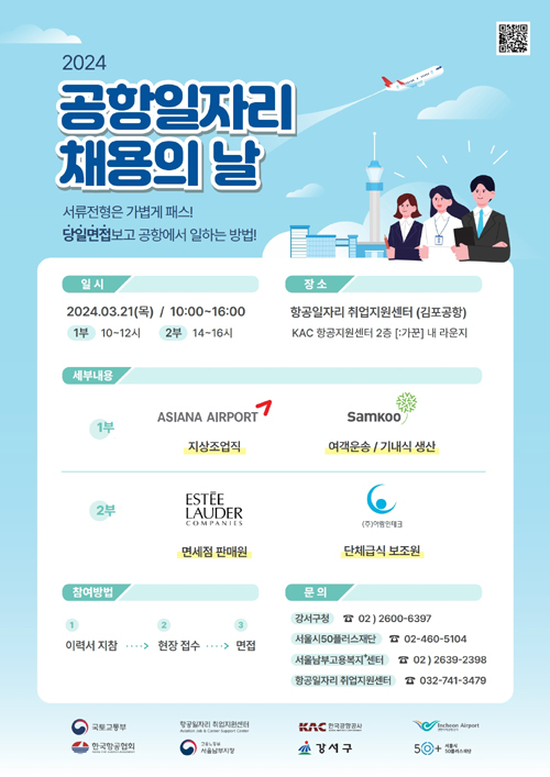 한국공항공사는 21일 김포공항 내 항공일자리 취업지원센터에서 국토교통부, 고용노동부, 인천국제공항공사, 한국항공협회, 강서구청, 서울시50플러스재단과 함께 공항일자리 채용의 날 행사를 개최한다고 17일 밝혔다.