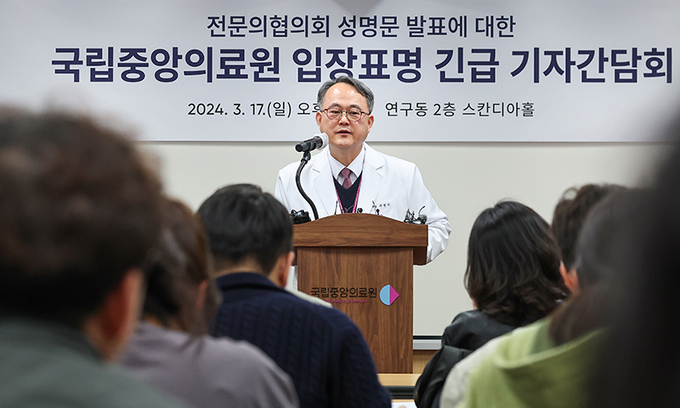 주영수 국립중앙의료원장이 17일 국립중앙의료원(NMC) 연구동에서 기자간담회를 열고 병원을 집단 이탈한 전공의들과 집단 사직을 시사한 전문의·교수들을 작심 비판했다.