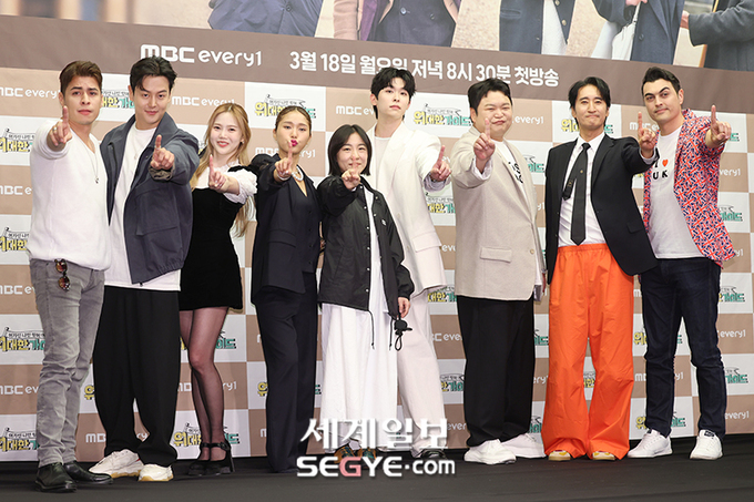 멕시코 출신 방송인 크리스티안 부르고스, 여행 유튜버 채코제, 그룹 오마이걸 효정, 미미, 배우 이시우, 고규필, 신현준, 영국 출신 방송인 피터 빈트(사진 왼쪽부터)가 18일 오후 서울 마포구 상암동 스탠포드호텔에서 열린 MBC에브리원 ‘위대한 가이드’의 제작발표회에 참석해 포즈를 취하고 있다.