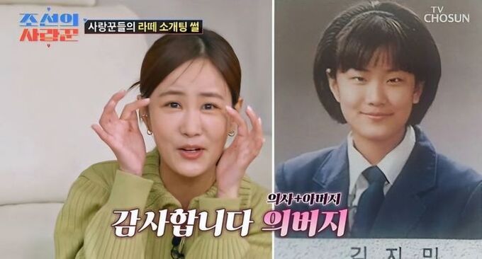 쌍커풀이 없는 졸업 사진도 공개됐다. 김지민은 “서울 와서 쌍꺼풀 생기고 유명해졌다. 감사합니다. 의버지(의사+아버지)”라고 말해 웃음을 안겼다.