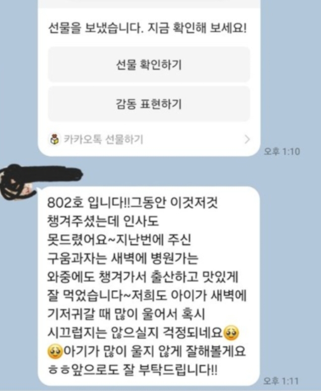 쪽지를 붙이고 얼마 뒤 아랫집은 A씨에게 카카오톡 기프티콘을 보내며 "그동안 다과 선물 주신 거 감사하게 잘 먹었다"며 "저희도 아기가 많이 울지 않도록 조심하겠습니다"고 했다.