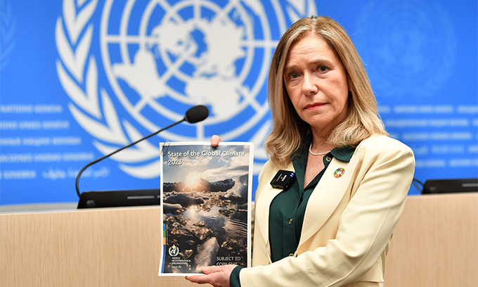 셀레스트 사울로 유엔 산하 세계기상기구(WMO) 사무총장이 19일(현지시간) 스위스 제네바 WMO 본부에서 열린 기자회견에서 ‘2023년 지구 기후변화보고서’를 들어 보이고 있다. 사울로 사무총장은 이날 “파리기후협약에서 합의했던 섭씨 1.5도 이내 제한선에 지금처럼 근접한 적이 없었다”며 “전 세계에 적색경보를 발령한다”고 선포했다.