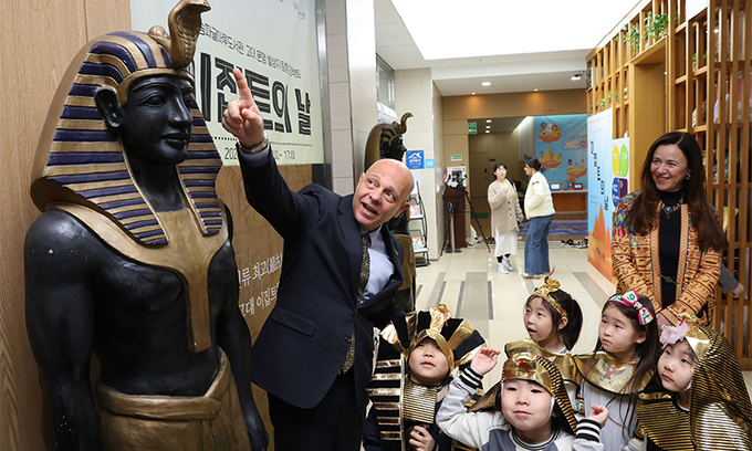 20일 서울 송파구 장지동 글마루도서관에서 열린 ‘이집트의 날’ 행사에서 칼리드 압델라흐만 주한 이집트대사(왼쪽 첫번째)가 이집트 전통의상을 입은 아이들에게 전시품에 대해 설명하고 있다. 이날 행사에서는 파피루스에 상형문자로 이름쓰기, 이집트 음식·전통의상 체험, 이집트 장신구 꾸미기 등 문화체험 등이 진행됐다.