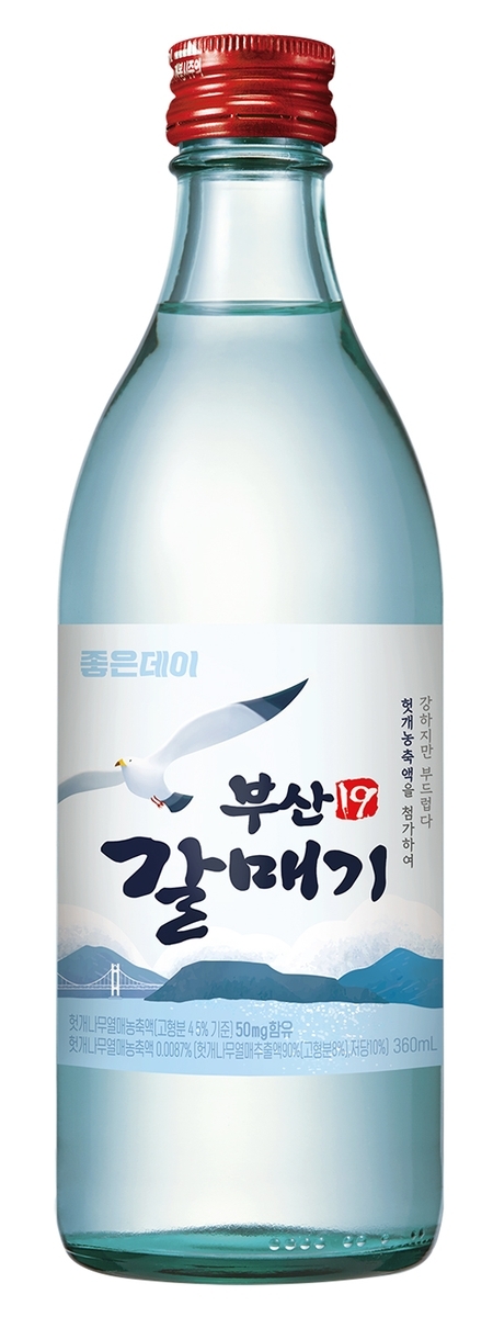 좋은데이 부산갈매기는 용랑 360㎖, 알코올 도수 19도, 주종은 일반증류주이다.