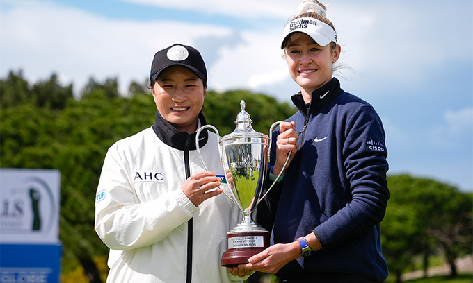 넬리 코르다(오른쪽)가 25일 미국 캘리포니아주 로스앤젤레스 인근 팔로스 버디스 골프클럽에서 열린 LPGA 투어 퍼힐스 박세리 챔피언십에서 통산 10승을 달성한 뒤 대회 호스트인 박세리와 트로피를 들고 활짝 웃고 있다.
