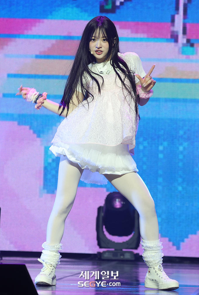 하이브(HYBE) 새 걸그룹 아일릿(ILLIT)의 민주가 25일 오후 서울 용산구 한남동 블루스퀘어에서 열린 미니 1집 '슈퍼 리얼 미(SUPER REAL ME)'의 쇼케이스에 참석해 열띤 공연을 펼치고 있다.