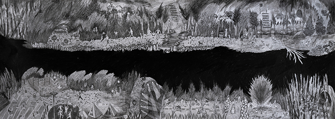 연약한 필선이 짙게 쌓여 까마득한 산과 강을 이루고 가벼운 종이가 거듭 뭉쳐 굳건한 성벽이 된다. 구전된 이야기들, 전염된 소문들, 신비한 상상들을 묻어 둔 종이 위의 검은 대지가 삼차원 공간을 향하여 자신의 몸을 일으킨다. 겹겹이 축적되어 단단해진 몸으로 전시 공간 벽면에 걸린 임선구의 화면이 마치 그 자체로서 진실이 된 하나의 설화 같다.