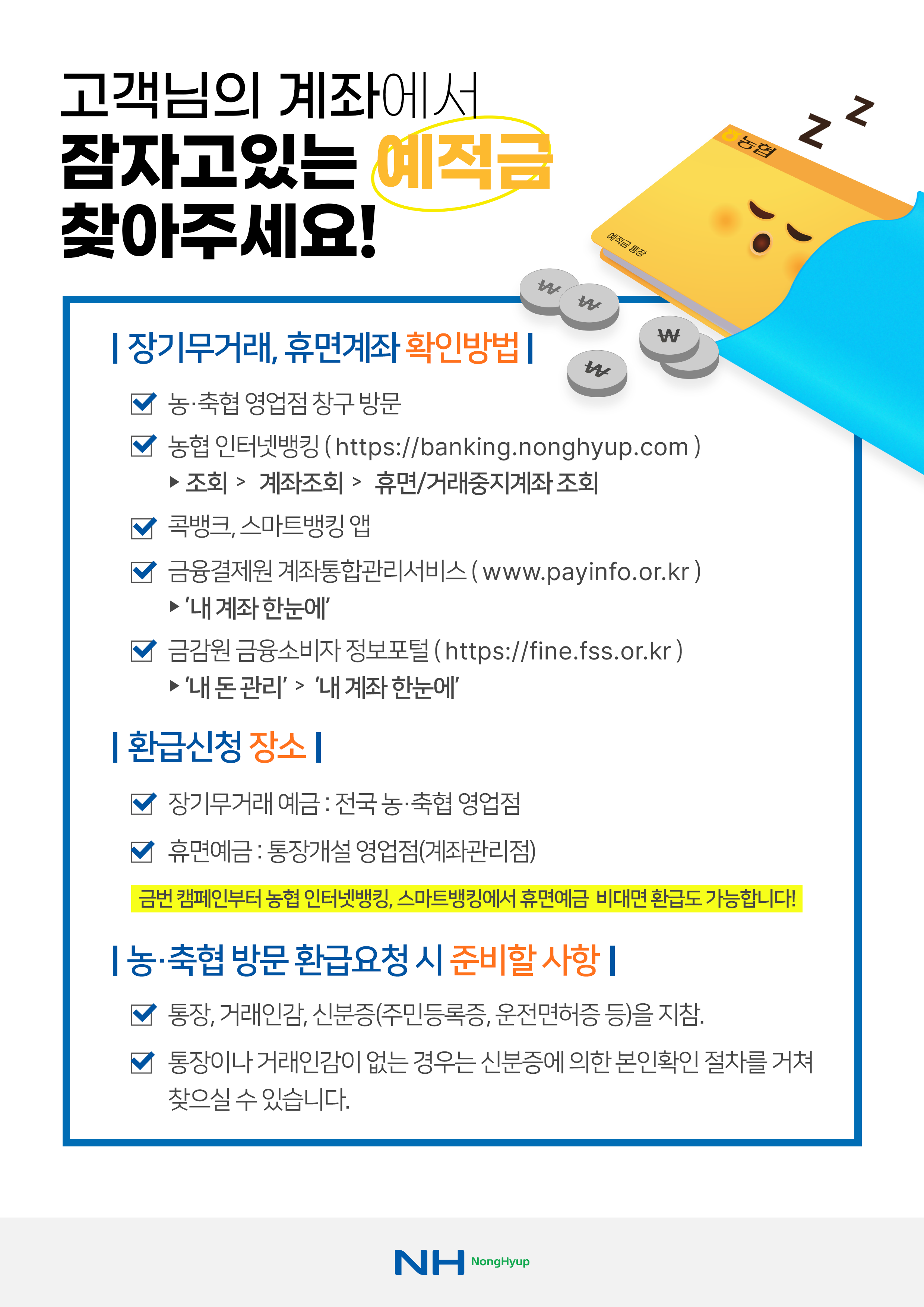 장기무거래예금은 전국 농·축협 영업점, 휴면예금은 통장을 개설한 영업점에서 환급 신청 가능하며 환급 신청을 위해서는 통장, 거래 인감, 신분증(주민등록증, 운전면허증 등)을 지참해야하고, 통장이나 거래 인감을 분실한 경우에는 본인확인 절차를 거치면 환급 가능하다. 또한, 농협 인터넷뱅킹/스마트뱅킹을 통해서도 장기무거래예금 및 휴면예금 환급이 가능하다.