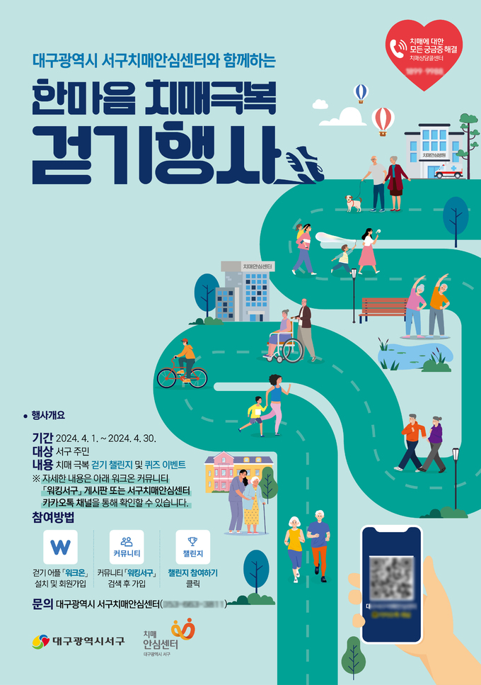 행사가 끝난 뒤 챌린지 목표 달성자 중 100명을 추첨해 상품도 제공한다. 행사 기간 중 서구치매안심센터 카카오톡 채널의 1대1 대화창으로 온라인 치매 상담실을 운영해 주민과의 소통을 확대할 계획이다.