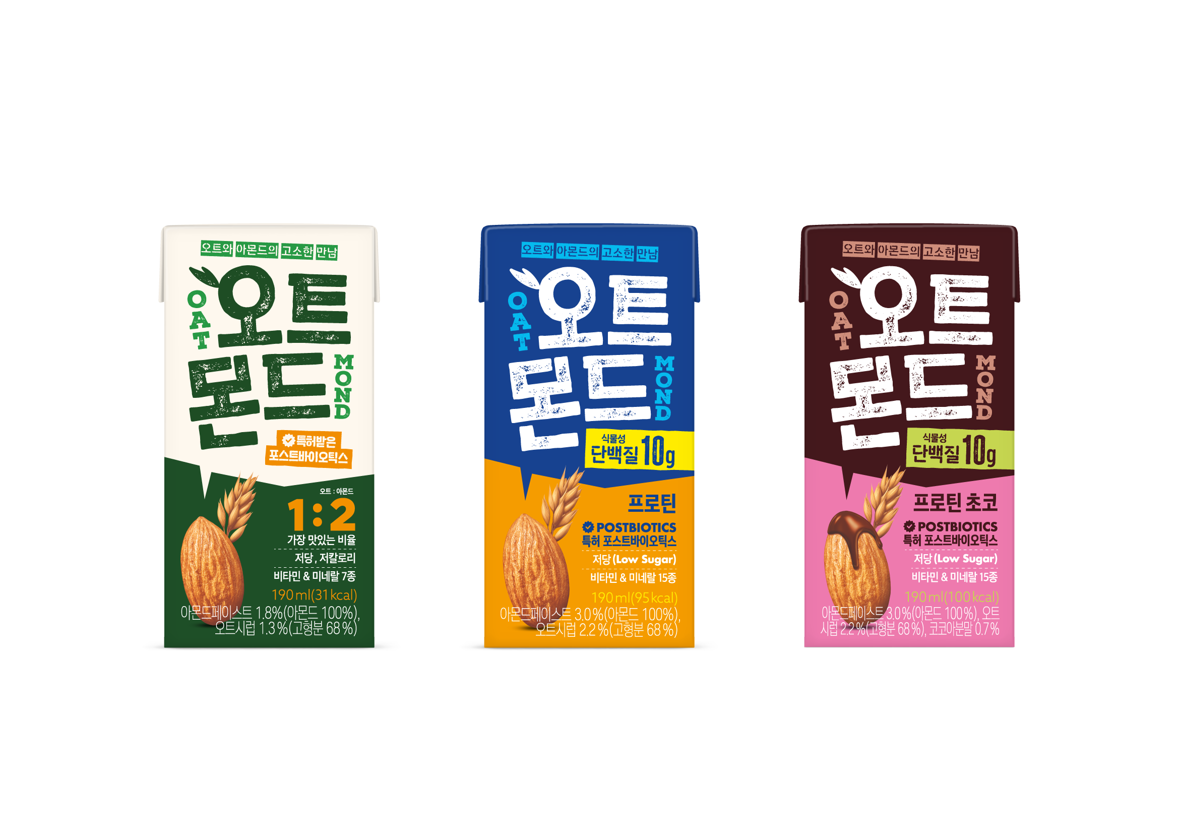 ‘오트몬드 오리지널’은 오트와 아몬드를 1 대 2 비율로 배합하고 사과, 호두, 코코넛 3가지 식물성 원료를 담은 식물성 음료다. 특허받은 식물 유래 유산균인 ‘포스트바이오틱스’를 함유했으며 비타민 5종과 미네랄 2종을 담은 것이 특징이다. 한 팩당 31㎉로 열량과 당 함량을 낮춰 부담 없이 마실 수 있다.