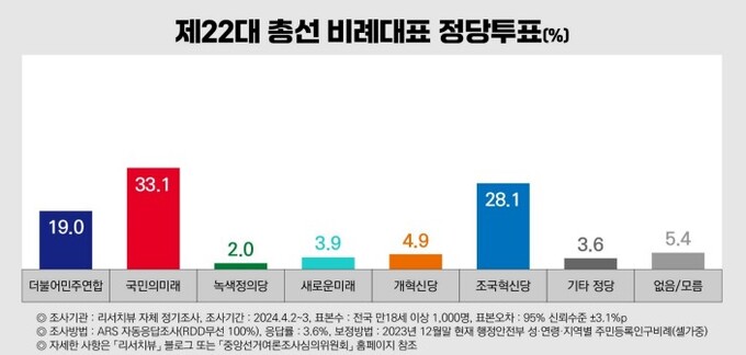 제22대 총선에서 비례대표 국회의원을 뽑는 정당투표에서 어느 정당에 투표하겠냐는 질문에 국민의미래 33.1%, 조국혁신당 28.1%, 더불어민주연합 19%로 집계됐다.