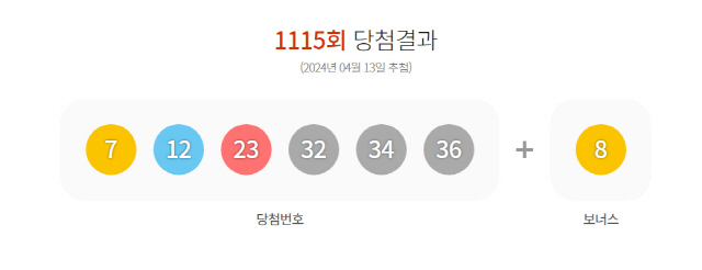 13일 제1115회 동행복권 로또 추첨 결과 ‘7, 12, 23, 32, 34, 36’이 1등 당첨 번호로 결정됐다. 2등 보너스 번호는 ‘8’이다.