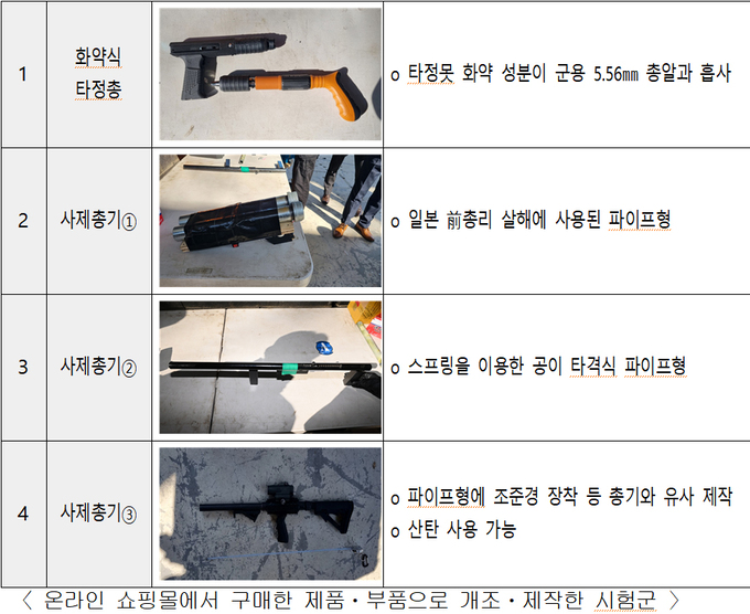 국정원이 직접 해외 쇼핑몰을 통해 화약식 타정총 1정, 여러 구매품으로 제작한 총기 3종 등으로 발사실험을 진행했더니 모두 인체에 치명상을 입힐 수 있는 것으로 드러났다.
