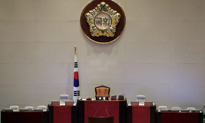 텅 비어있는 국회의사당 본회의장의 국회의장석 모습. 연합뉴스