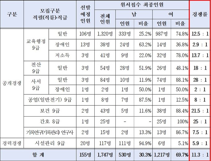 모집 직렬별 경쟁률은 △교육행정9급(일반) 12.5대 1 △전산9급 18대 1 △사서9급(일반) 28대 1 △공업9급(일반전기) 8대 1 △보건9급 21.5대 1 △간호8급 25대 1 △기록연구사 7.5대 1로 나타났다.