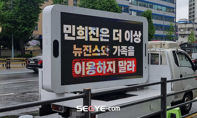 하이브와 자회사인 어도어의 내홍이 갈수록 격화되는 가운데, 뉴진스 팬들이 트럭 시위를 시작했다.