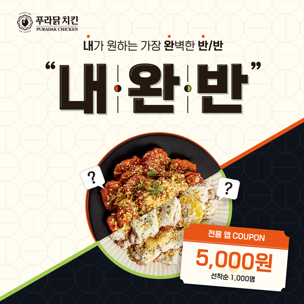 오븐-후라이드 치킨 전문 브랜드 푸라닭 치킨이 '내.완.반' 한정 판매를 기념하여 푸라닭 전용 앱에서 '내.완.반' 전용 5,000원 쿠폰을 선착순 제공하는 이벤트를 진행한다.
