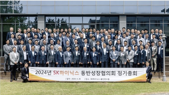 SK하이닉스가 26일 경기도 용인 SK아카데미에서 ‘2024년 동반성장협의회 정기총회’를 열고 협의회 소속 소부장(소재·부품·장비) 협력사들과 EGS(환경·사회·지배구조) 경영 실천 방안을 공유했다고 밝혔다. 이날 행사에는 곽노정 SK하이닉스 대표이사 사장을 비롯한 경영진과 87개 협력사 대표들이 참석했다.