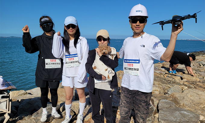 27일 충남 당진시 석문방조제에서 열린 7회 세계드론낚시대회 참가한 ‘물고기 못 만져요’팀. 윤교근 기자