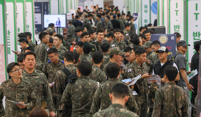 29일 경기 고양시 일산서구 킨텍스에서 열린 국군장병 취업박람회에서 군 장병들이 기업 부스를 둘러보고 있다. 국방부 주최, 국방전직교육원 주관으로 열리는 이번 박람회는 장병 선호 업종별 채용관 및 군 간부 출신 현직자들의 멘토링, 명사 취업특강, 진로직업 체험 부대행사가 마련되었다.
