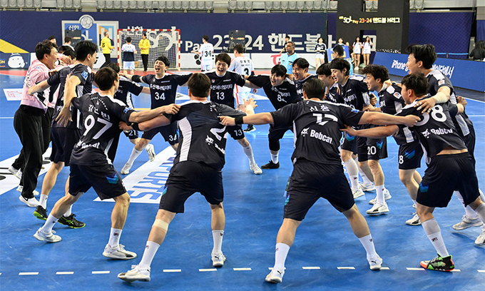 남자 핸드볼 두산 선수들이 30일 서울 송파구 SK핸드볼경기장에서 열린 2023∼2024시즌 핸드볼 H리그 챔피언 결정전(3전2승제) 2차전에서 SK 호크스를 28-19로 꺾고 2연승으로 우승을 차지한 뒤 기뻐하고 있다. 윤경신 감독이 이끄는 두산은 이전 H리그 명칭이었던 ‘SK핸드볼 코리아리그’ 2015시즌부터 9연속 통합 우승을 달성했다.