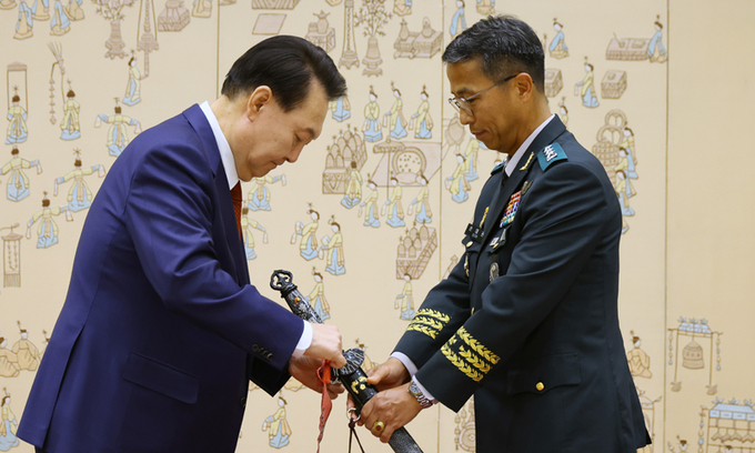 윤석열 대통령이 1일 서울 용산 대통령실에서 중장으로 진급한 손대권 신임 육군 군수사령관으로부터 진급 및 보직 신고를 받고 삼정검 수치를 수여하고 있다. 이날 정진팔 육군 교육사령관, 권대원 지상작전사령부 참모장, 이승오 합동참모본부 작전본부장, 원천희 국방정보본부장, 서진하 3군단장, 박재열 7군단장도 함께 삼정검 수치를 받았다.