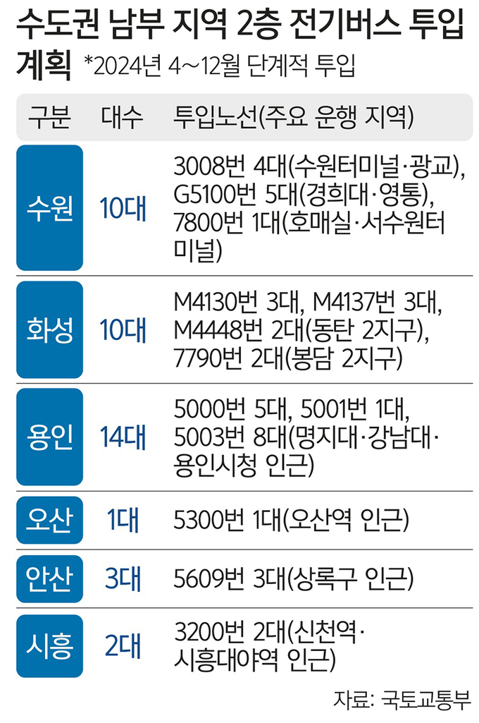 정부는 우선 광역버스 공급 확대를 위해 올해 활용할 수 있는 2층 전기버스 50대 가운데 40대(80%)를 4월부터 12월까지 수원, 화성, 용인 등에 단계적으로 투입한다. 이를 통해 하루 광역버스 수송력이 약 1만8400명 추가 확대될 것으로 국토부는 기대했다.