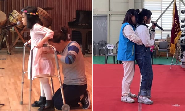 영상에는 ‘장애인의 날 노래자랑’ 행사에서 어린 여자아이가 보조기구에 의지한 채 노래를 부르고, 어머니는 그 뒤에서 딸이 넘어지지 않도록 허리를 숙이고 무릎을 꿇은 채 허리를 받쳐 주는 모습이 담겼다.