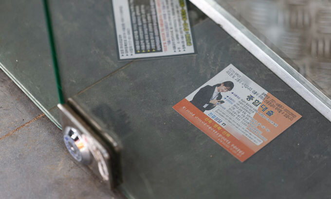 대출 전단지가 놓인 한 상점의 문이 닫혀있다. 연합뉴스