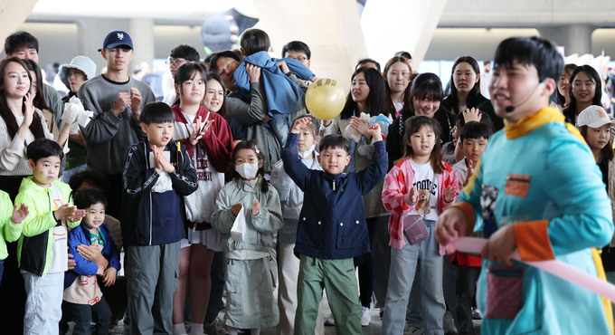6일 서울 중구 동대문디자인플라자(DDP)에서 열린 'DDP 봄축제: 디자인 동물원'을 찾은 어린이들이 풍선 만들기 공연을 보며 즐거운 시간을 보내고 있다.