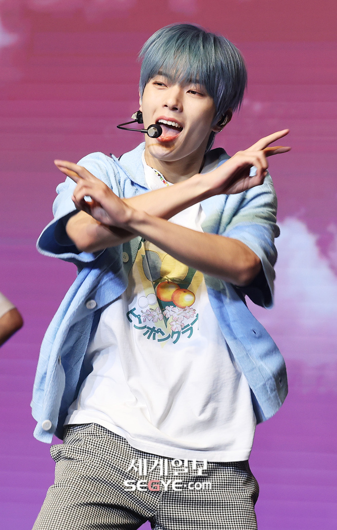 그룹 휘브 이정이 14일 오후 서울 강남구 청담동 일지 아트홀에서 열린 두 번째 싱글 '이터널 유스: 킥 잇(ETERNAL YOUTH : KICK IT)'의 쇼케이스에 참석해 열띤 공연을 펼치고 있다.