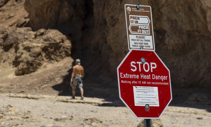 미국 캘리포니아주에 있는 데스밸리 국립공원에서 한 관광객이 걷고 있다. AP연합뉴스