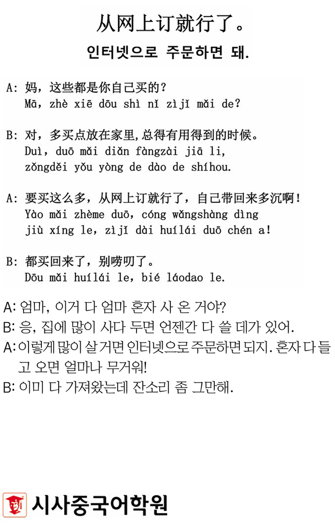 [시사중국어학원의 리얼 중국어 회화] 인터넷으로 주문하면 돼. 입력 : 2024-05-20 18:20:28 수정 : 2024-05-20 18:20:28 구글 네이버 유튜브 Copyright ⓒ 세계일보. 무단 전재 및 재배포 금지 세계일보