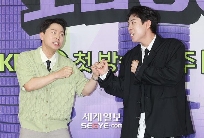 개그맨 형제 양세찬(사진 왼쪽)과 양세형이 21일 오전 서울 KBS에서 열린 전 국민 부자 메이커 프로젝트 KBS 2 TV 새 예능프로그램 '하이엔드 소금쟁이'의 제작발표회에 참석해 포즈를 취하고 있다.