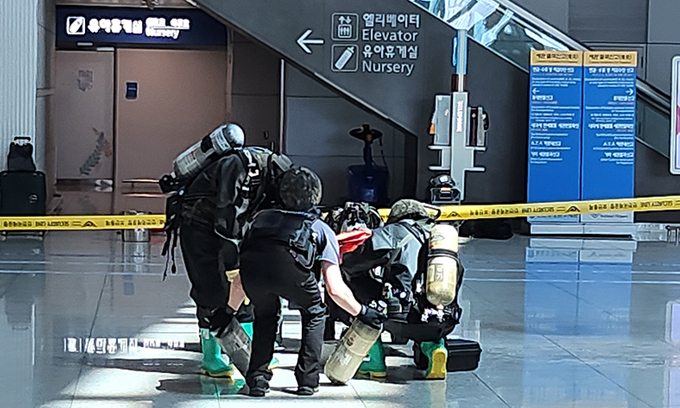 인천국제공항에서 신경작용제로 확인되는 가루가 나와 경찰과 군 당국이 성분분석을 하고 있다.