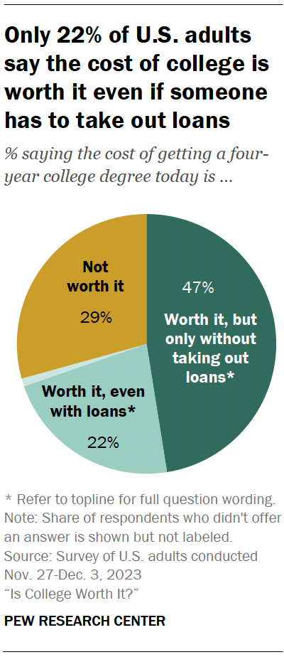 4년제 대학 학위를 얻기 위해 대출을 받는 것이 그만한 가치가 있다고 응답한 응답자도 22%에 그쳤다. 29%는 대출을 받아서 대학에 갈 가치가 없다고 답했고, 47%는 대출을 받지 않아도 되는 경우 대학 학위가 가치가 있다고 답했다.