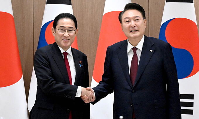 윤석열 대통령이 26일 서울 용산 대통령실 청사에서 기시다 후미오 일본 총리와의 정상회담에 앞서 악수하며 기념촬영을 하고 있다.