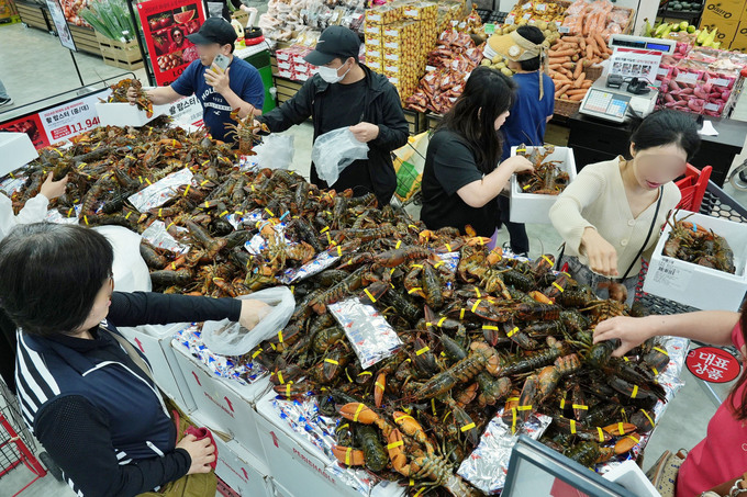 30일 고객 체류형 매장으로 새롭게 오픈한 30일 경기 롯데마트 의왕점을 찾은 고객들이 수산 매대에서 활 랍스터를 구매하고 있다, 롯데마트는 30일부터 다음달 5일까지 캐나다산 ‘활 랍스터(마리/냉장/400g)’를 행사카드(롯데/신한/KB국민/NH농협) 결제 시 35% 할인한 1만 2935원에 판매한다. 700그램(g) 내외의 ‘대’ 크기인 활 랍스터 또한 1일(토)부터 행사카드 결제 시 35% 할인 혜택을 적용해 2만 4635원에 만나볼 수 있다. 롯데마트가 해당 행사를 위해 준비한 물량은 총 15만 마리로, 랍스터 준비 물량 중 역대 최대 물량이다.