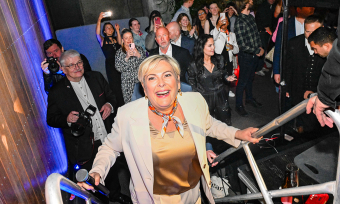 2일(현지시간) 끝난 아이슬란드 대통령선거에서 할라 토마스도티르 후보가 출구조사 결과 당선으로 예측된 뒤 지지자들에게 연설하기 위해 밝은 표정으로 연단으로 올라가고 있다. 기업인 출신의 토마스도티르 후보는 34.3%를 득표해 28년 만에 아이슬란드 역사상 두 번째 여성 대통령으로 당선됐다.